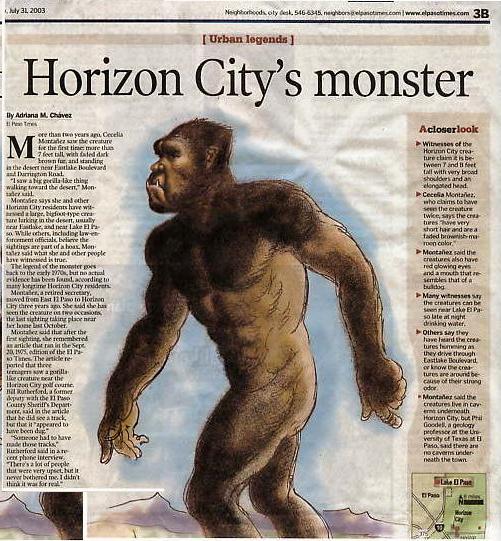 “Montañez is a retired secretary, and moved to Horizon City from East El Paso in October of 2002. She has seen the creature known locally as the Horizon City Monster on two separate occasions.”
